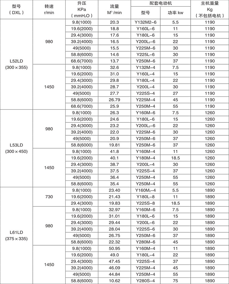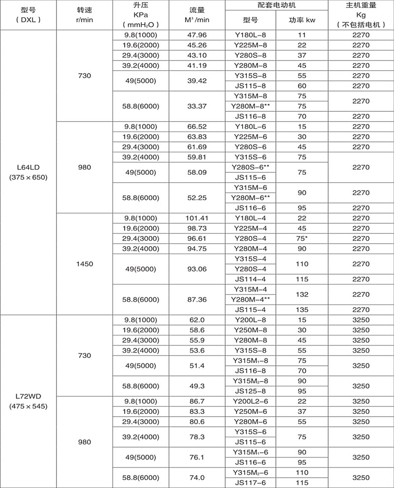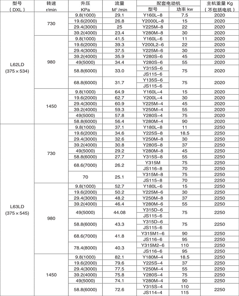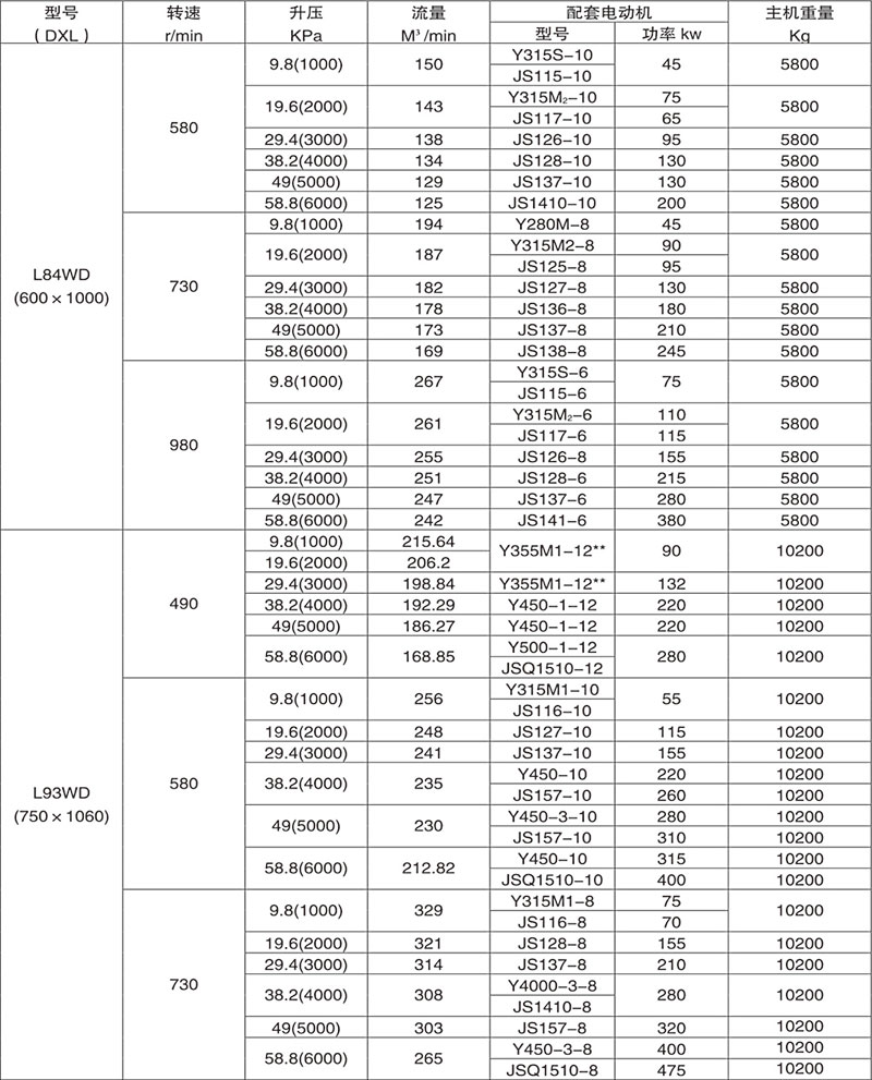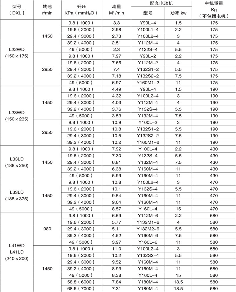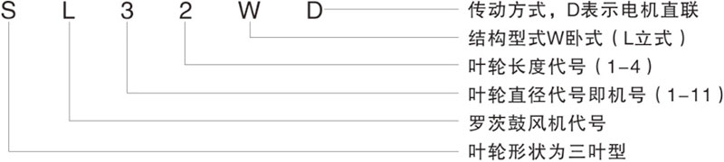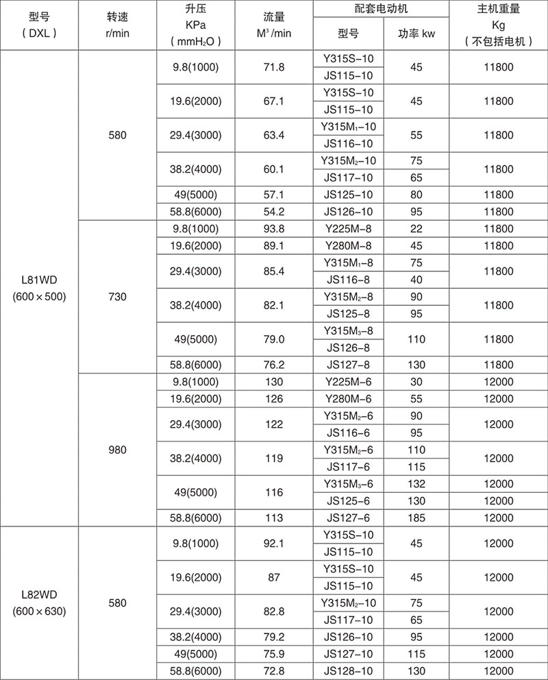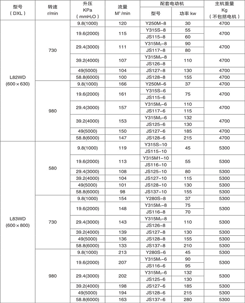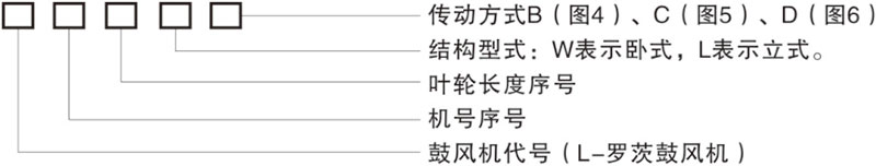 Example: L84WD said No. 8 model (impeller diameter of 600mm, two rotor center distance 400mm), No. 4 impeller length) (1000mm), horizontal, coupling direct drive.