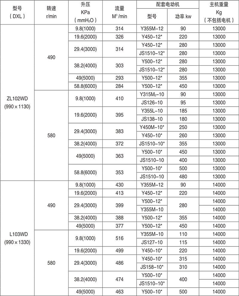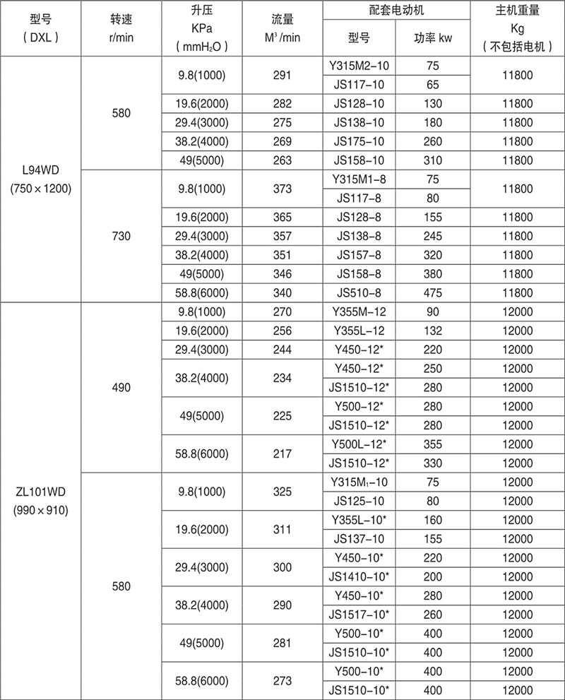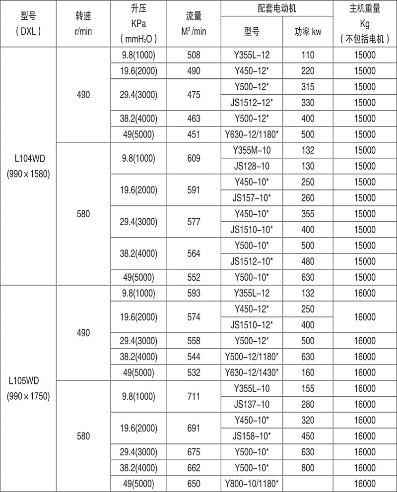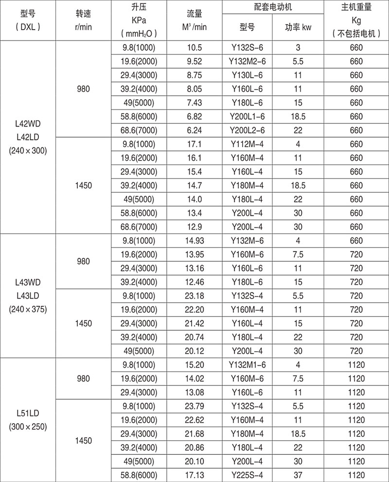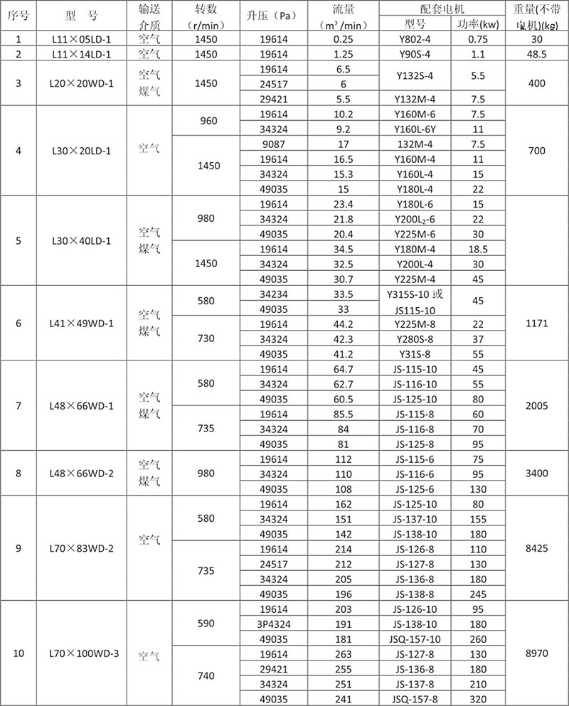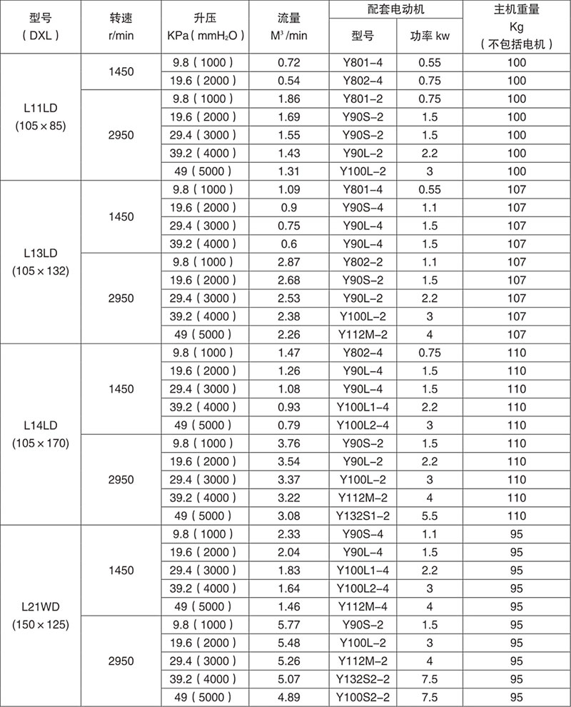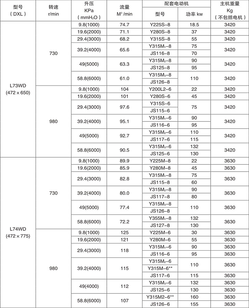 Example: L84WD said No. 8 model (impeller diameter of 600mm, two rotor center distance 400mm), No. 4 impeller length) (1000mm), horizontal, coupling direct drive.