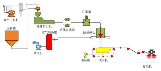 The automatic feeding machine automatically sucks the drawing grade polypropylene into the extruder, and the extruder heats and melts the PP particles to the liquid state. The Roots blower or air compressor and air tank compressed air is sent to the oven for heating, and the hot air is used to force the polypropylene material melted into a liquid to be ejected from the nozzle to form a filament (the nozzle contains hundreds of small holes ) After that, the spun filament reaches the receiving equipment horizontally, and then rolls the non-woven fabric with a roller press.